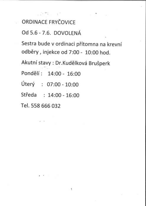 Úvod > O obci > Aktuality > Ordinace praktického lékaře Fryčovice - 05.06. - 07.06.2023 DOVOLENÁ