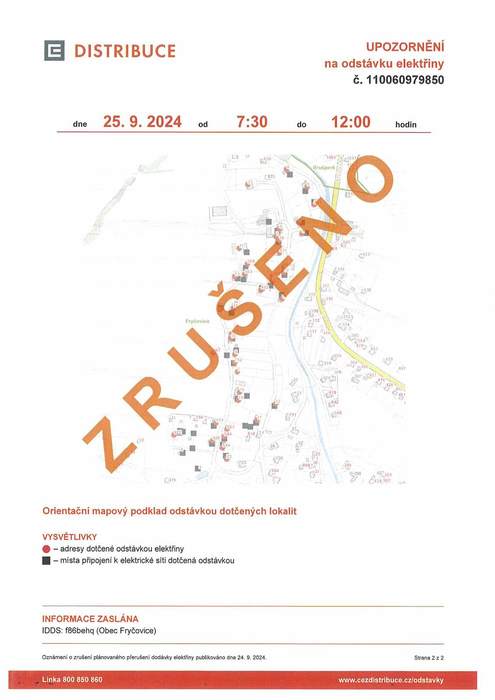 Oznámení o ZRUŠENÍ plánované odstávky elektrické energie 25.09.2024